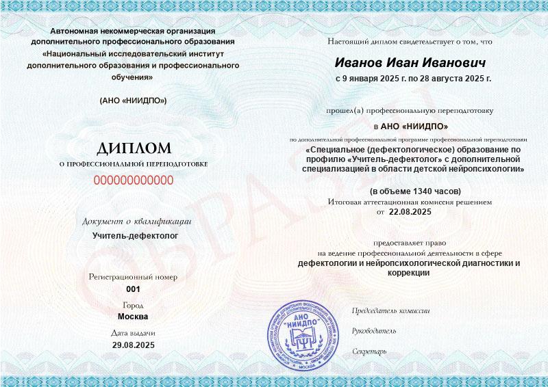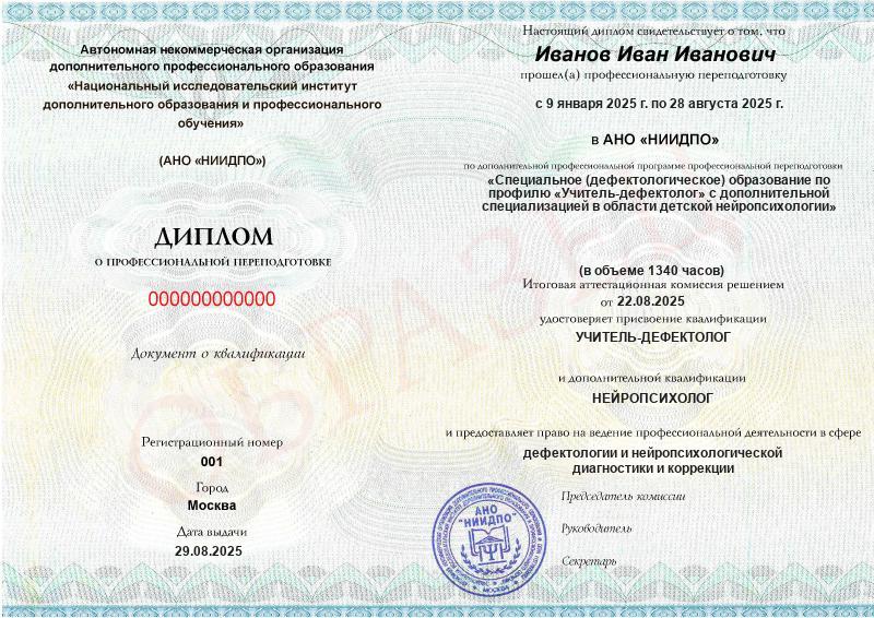 Специальное (дефектологическое) образование по профилю «Учитель-дефектолог» с дополнительной специализацией в области детской нейропсихологии (1340ч)