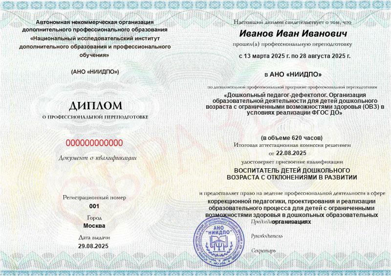 Да, документы оформляются на бланках с защитой от подделок, заполняются на русском языке, в них ставится печать АНО «НИИДПО».