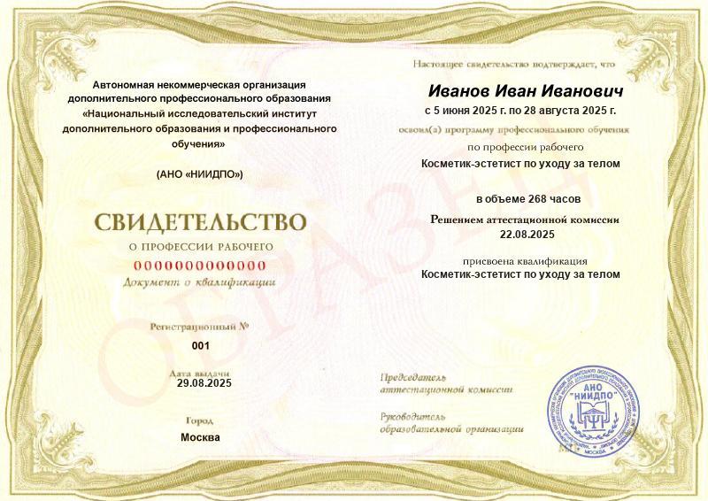- Квалификация: Косметик-эстетист по уходу за телом