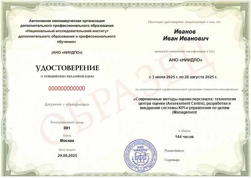 Современные методы оценки персонала: технология центра оценки (Assessment Centre), разработки и внедрения системы KPI и управления по целям (Management by Objectives) (144ч)