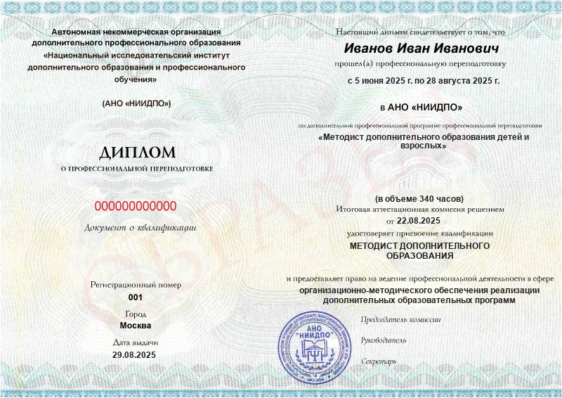 Да, документы оформляются на бланках с защитой от подделок, заполняются на русском языке, в них ставится печать АНО «НИИДПО».
