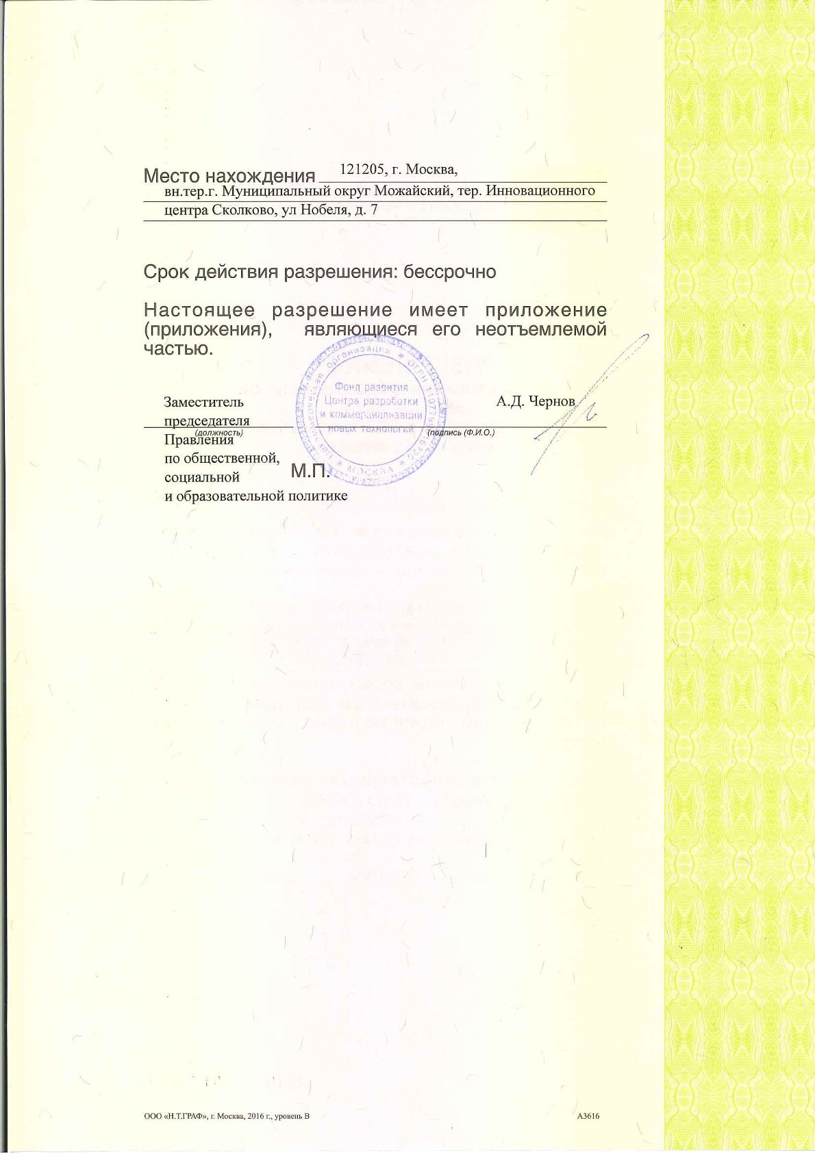 Разрешение на осуществление образовательной деятельности на территории Инновационного научно-технологического центра «Интеллектуальная электроника - Валдай» серии 2025-12-01 № 00001