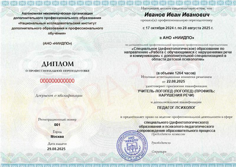 - 2 квалификации: Учитель-логопед (логопед) (профиль: нарушения речи) + Педагог-психолог